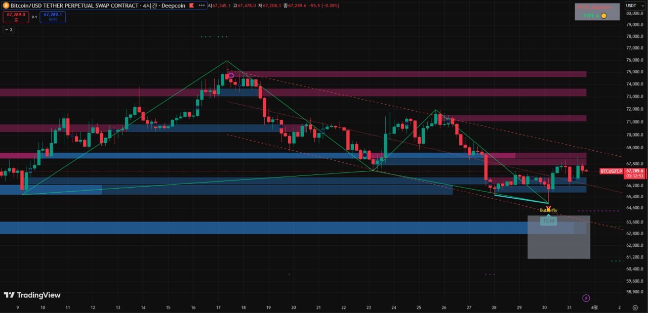 나비 모양의 선형들 끝에 발생되는 타점으로 기존에는 전문 기관, 트레이더들이 여러개의 지표를 일일히 분석 후 가상선을 그어가며 추세 전환이 예측되는 지점을 잡아내는 패턴 양식